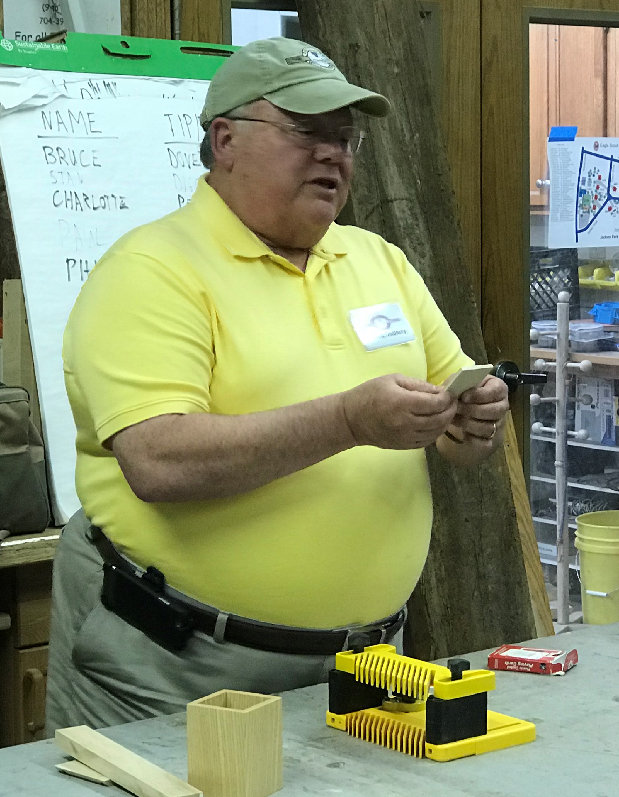 This month’s meeting presentation was a collaborative session with member participation and a competition for the best voted on Gadget, Tip or Trick. Congratulations to Phil DeBerry for winning the $25 gift certificate to Woodcraft and to runner up Mark Willingham. Entrants and their entries included: